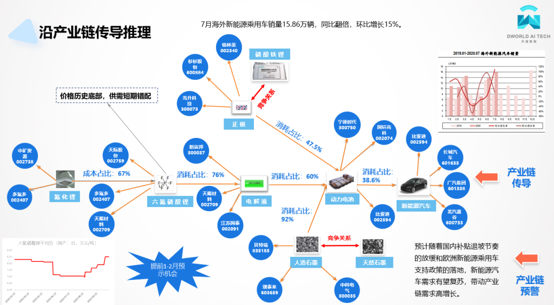 通过产业链图谱分析,跟踪产业链上的产品状况,可以发现新能源新能源汽车需求的复苏,直接带动了电解液相关产品价格的上涨,尤其是电解液的核心材料六氟磷酸锂,因为其不易保存,库存量小、库存周期短的特点。需求端快速增长叠加供给端去库存,六氟供需短期出现错配,再叠加价格处于历史底部,有着强烈的上涨预期。